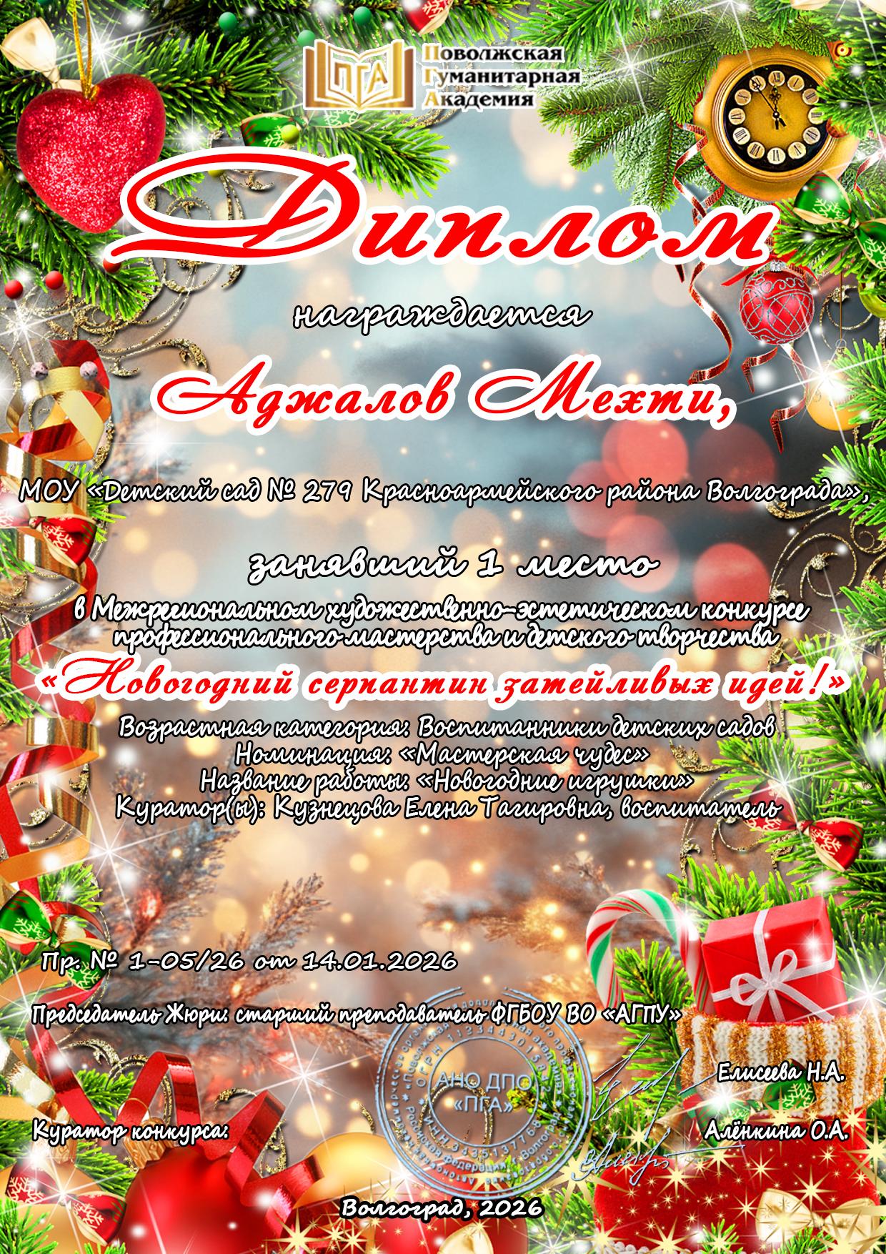 17 педагогов и 12 воспитанников МОУ Детского сада № 279 приняли участие в Межрегиональном художественно-эстетическом конкурсе профессионального мастерства и детского творчества: «Новогодний серпантин затейливых идей!», с 18.12.2025 по 12.01.2026г. Поздравляем педагогов и детей с победой в Конкурсе: В номинации №1: «Новогодний символ – 2026» – символ нового года - воспитанницу группы компенсирующей направленности для детей со сложным дефектом «Особый ребенок» № 6 Чиж Анну (куратор Башилова Е.Е., воспитатель) - 1 место. В номинации №2: «Мастерская чудес» – декоративно-прикладное творчество -воспитанника группы общеразвивающей направленности № 3 Аджалова Мехти (куратор Кузнецова Е.Т., воспитатель) - 1 место; Бузина Дениса воспитанника группы компенсирующей направленности для детей с НОДА № 10 (куратор Трещева О.В., воспитатель) - 2 место. В номинации №3: «Карнавал новогодних игрушек» – декоративно-прикладное творчество - воспитанницу группы компенсирующей направленности для детей с НОДА № 5 Бедневу Алису (куратор Децина О.П., воспитатель) - 1 место. В номинации №4: «Школа искусств Деда Мороза» – изобразительное искусство - воспитанницу группы компенсирующей направленности для детей со сложным дефектом «Особый ребенок» № 6 Темникову Елену (куратор Конюхова Е.В., воспитатель) - 1 место; воспитанницу группы общеразвивающей направленности № 3 Почевалову Арину (куратор Кузнецова Е.Т., воспитатель) - 2 место. В номинации №6: «И вот она, нарядная, на праздник к нам пришла» - конкурс новогодних ёлок - воспитанницу группы компенсирующей направленности для детей со сложным дефектом «Особый ребенок» № 6 Алексееву Анастасию (куратор Башилова Е.Е., воспитатель) - 1 место. В номинации №7: «Новый год отметим вместе – стихами, танцами и песней!» - творческий конкурс - Трифонова Савелия воспитанника группы компенсирующей направленности для детей с НОДА № 10 (куратор Бутковская С.И., педагог-психолог) - 1 место; воспитанника группы компенсирующей направленности для детей с НОДА № 9 Матющенко Льва (куратор Ничепорчук Т.П., учитель-логопед) - 1 место; Бут Варвару воспитанницу группы компенсирующей направленности для детей с НОДА № 10 (куратор Шевлякова Е.И., учитель-логопед) - 2 место; Афанасьева Геннадия воспитанника группы компенсирующей направленности для детей с НОДА № 9 (куратор Князева В.Ф., воспитатель) - 2 место; Номинация №9: «Волшебство Нового года: методические шедевры» - Самбекова О.Ю., воспитатель; Конюхова Е.В., воспитатель; Кузнецова Е.Т., воспитатель; Шевлякова Е.И., учитель-логопед; Косенко Е.В., воспитатель; Ничепорчук Т.П., учитель-логопед - 1 место. Вагова М.Е., воспитатель; Бутковская С.И., педагог-психолог; Князева В.Ф., воспитатель; Демиденко О.В., воспитатель; Плюснина С.Н., воспитатель; Полетаева А.Н., воспитатель; Трещева О.В., воспитатель - 2 место. Башилова Е.Е., воспитатель; Шаркова В.А., воспитатель - 3 место. Желаем дальнейших побед педагогам и воспитанникам детского сада!