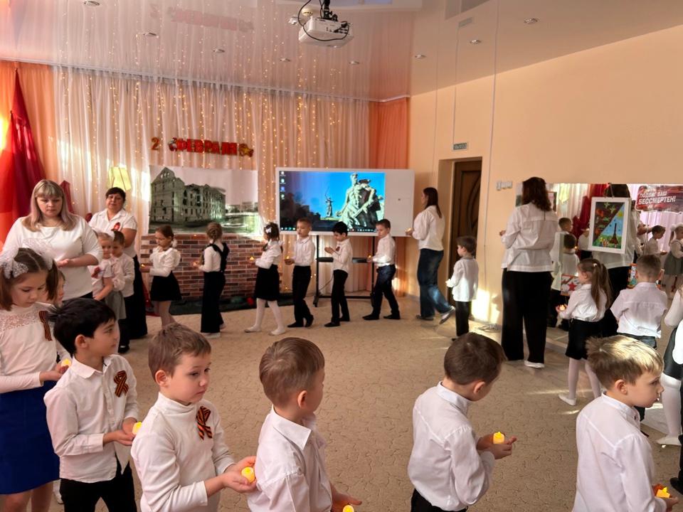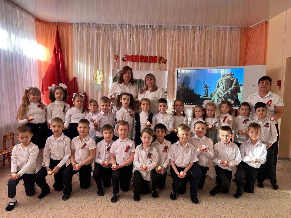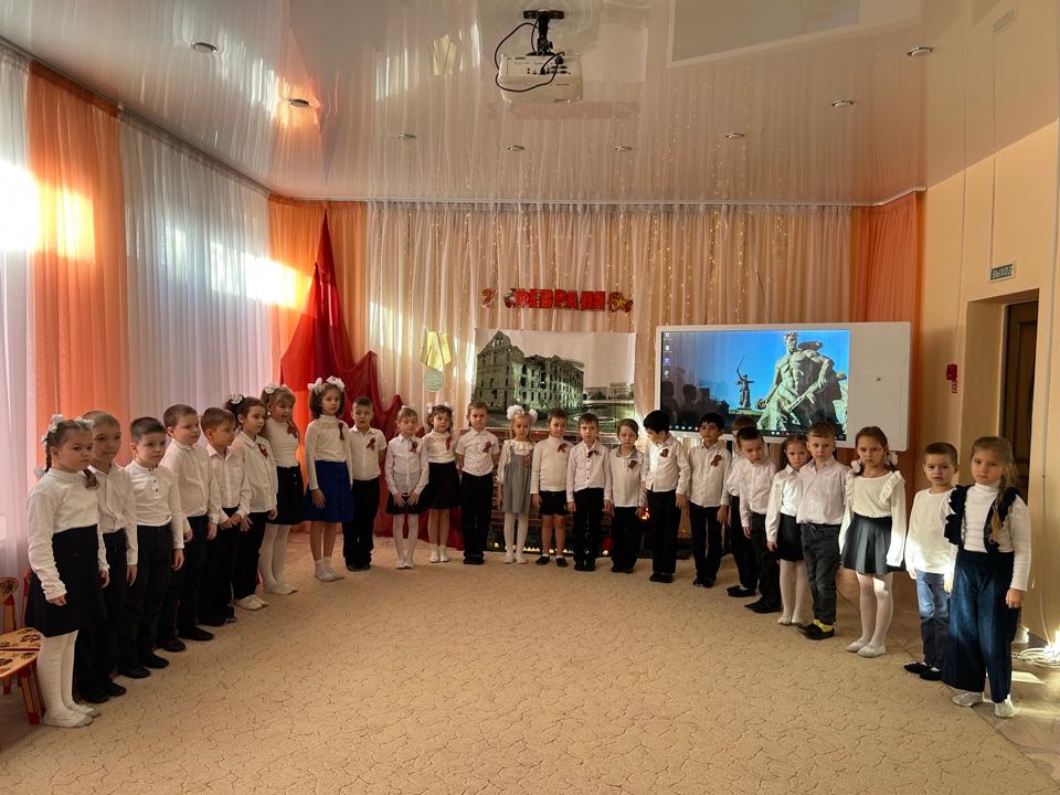 2 февраля отмечается День воинской славы России – День разгрома советскими войсками немецко-фашистских войск в Сталинградской битве. В подготовительных к школе группах прошел познавательный час " Расскажите детям", где ребята узнали, что в течение 200 тяжелых дней и ночей шли ожесточенные бои. Сталинградская битва стала началом коренного перелома в войне. Во всех возрастных группах оформлены уголки памяти и славы. Проведены беседы с детьми на тему «2 февраля — День Победы в Сталинградской битве» с использованием иллюстраций, стихов о войне и других материалов.